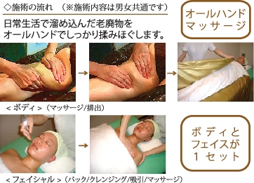 身体を温めている間にフェイシャルケアを行います。酵素パックをした後にフェイスマッサージ(首、デコルテ付)をオールハンドでケアします。